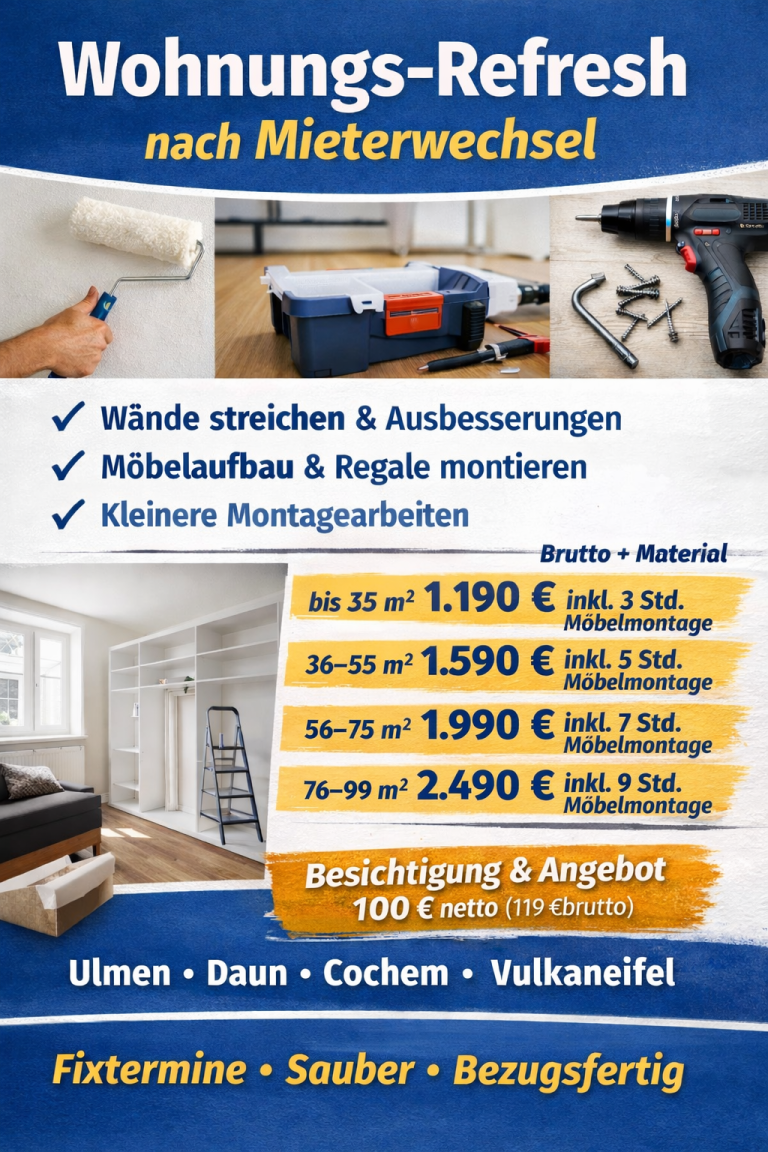 Ich unterstütze Vermieter und Privatkunden im Raum Vulkaneifel bei der schnellen Vorbereitung von Wohnungen. Mein Schwerpunkt liegt auf Wohnungs-Refresh nach Mieterwechsel, Malerarbeiten sowie Möbelaufbau und Montagearbeiten.
